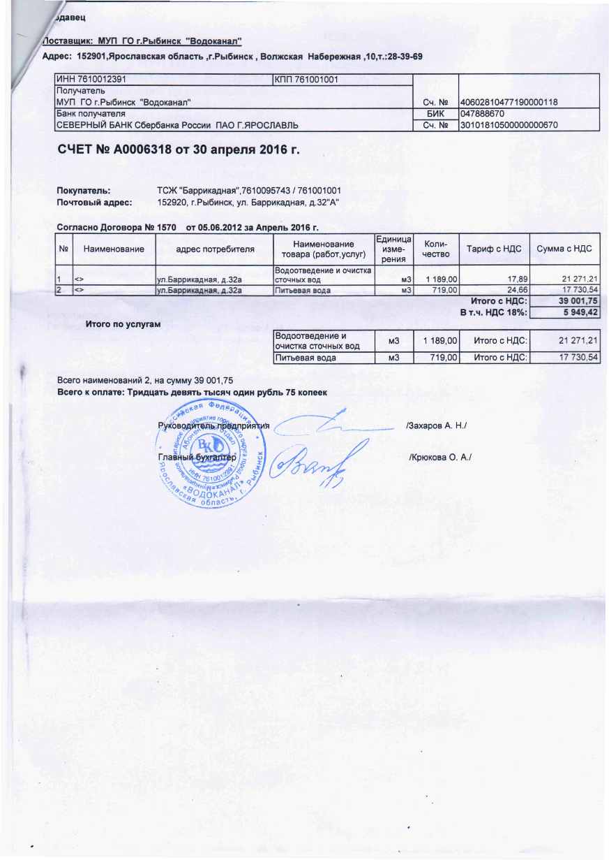 Счет МУП ГО "Водоканал" апрель 2016г.