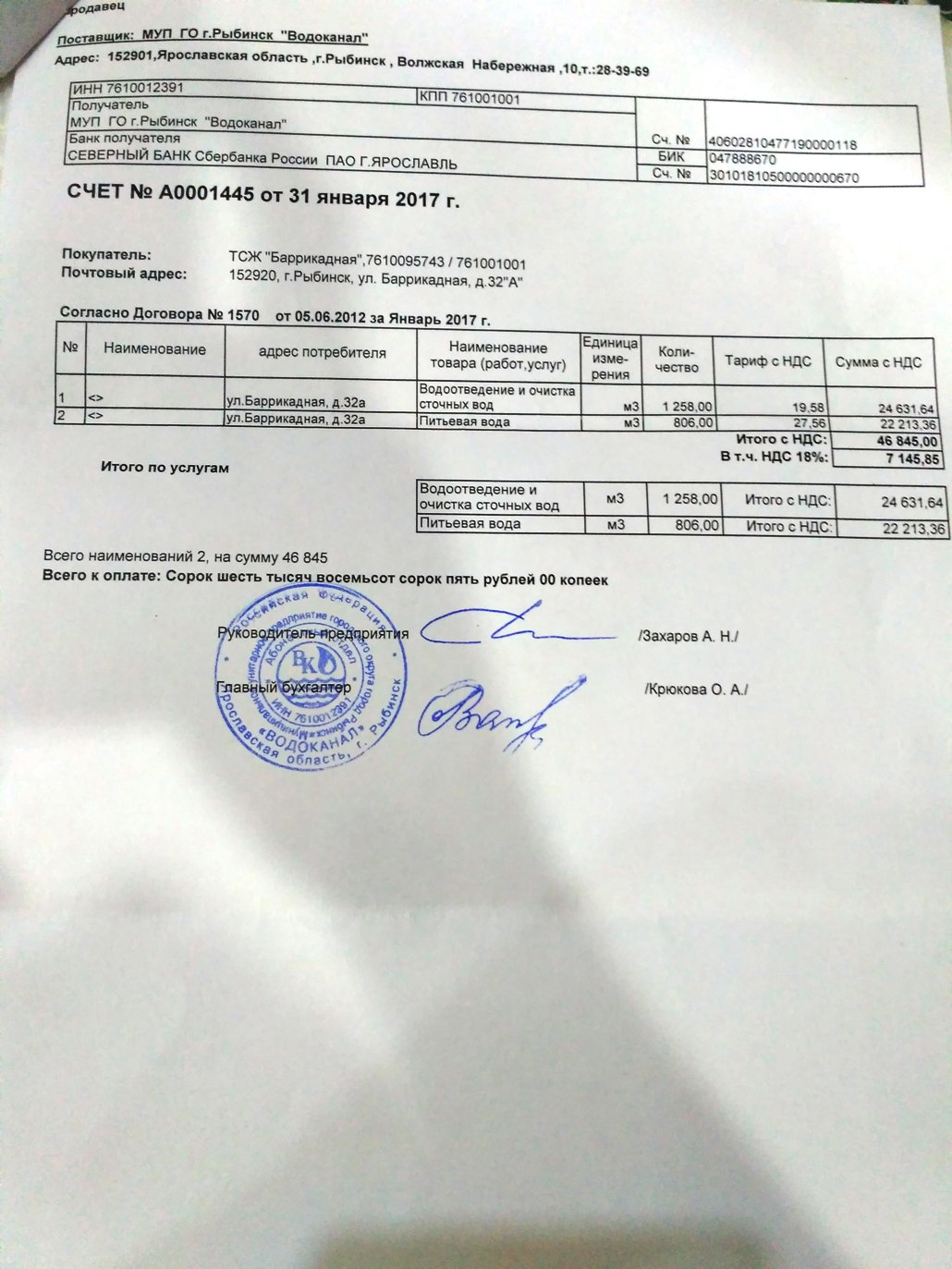 Счет МУП ГО "Водоканал" Январь 2017г.