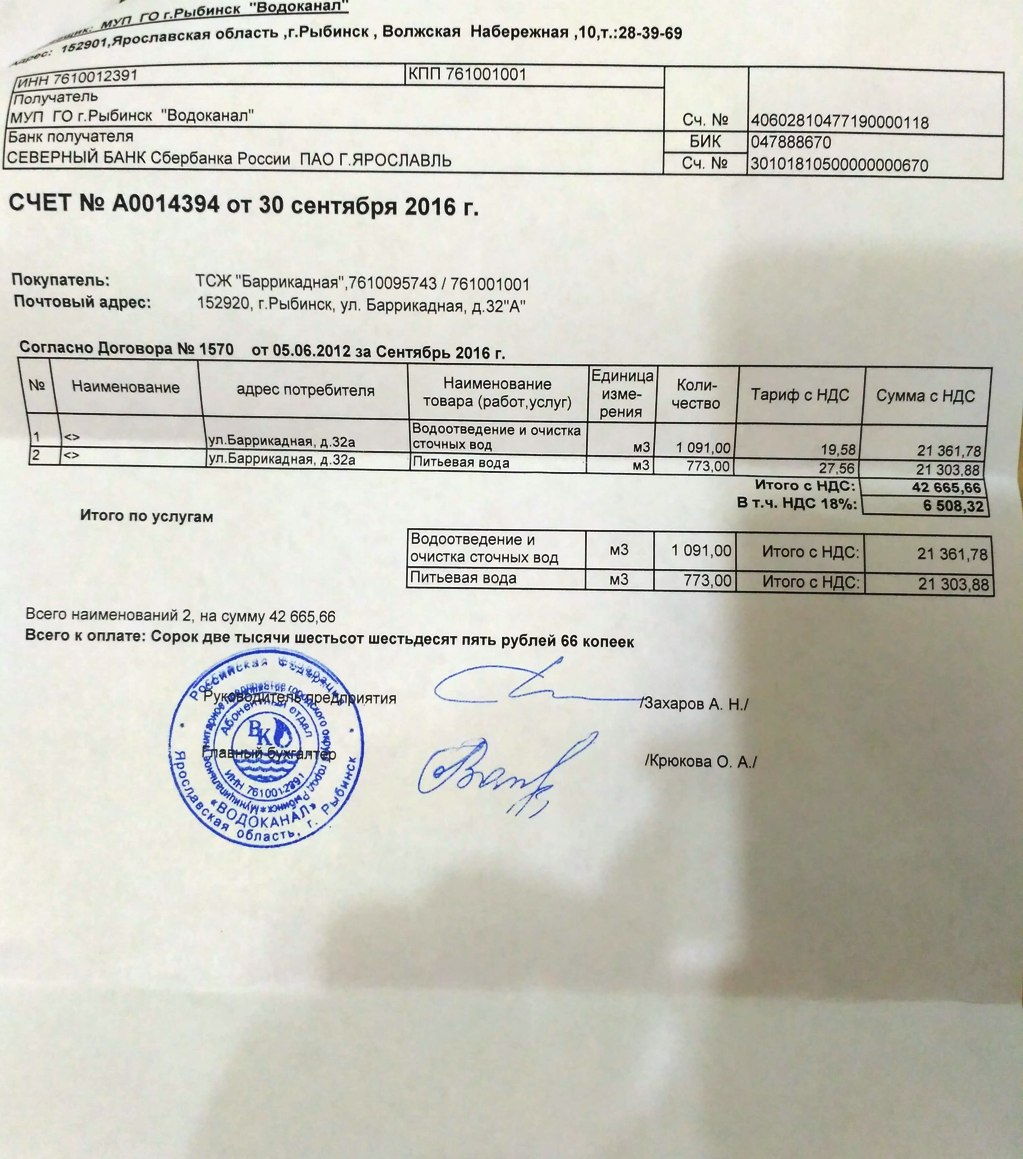 Счет МУП ГО "Водоканал" сентябрь 2016г.