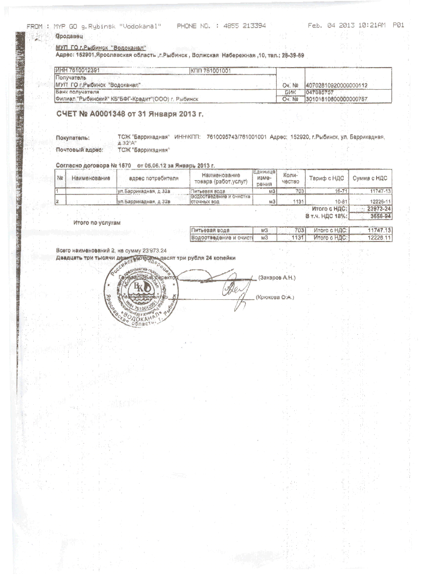 Счет Водоканал январь 2013 года
