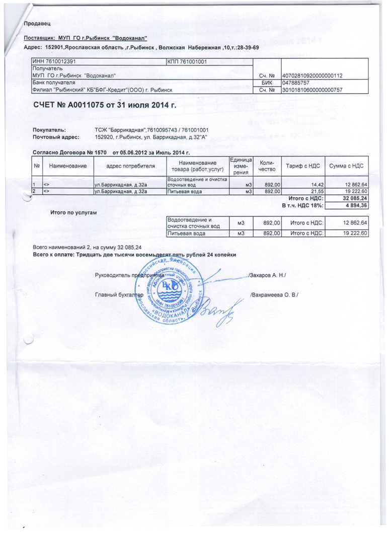 Счет Водоканал Июль 2014г.
