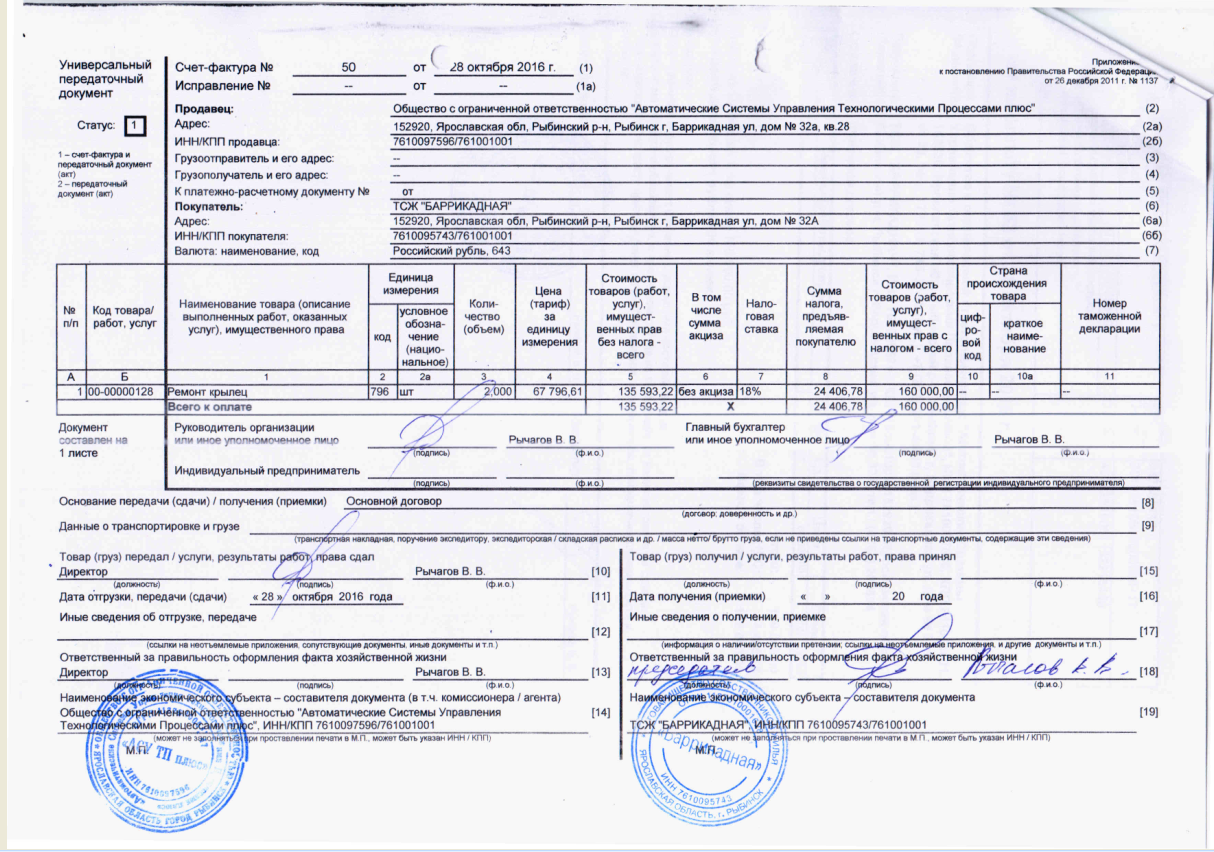 Счет АСУТП ремонт крылец 1,2 подъезд октябрь 2016г.