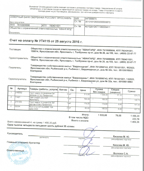 Счет Авангард август 2016г. хоз.расходы краска