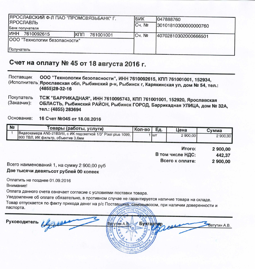 Счет ООО "Технологии Безопасности" август 2016г. видеокамера