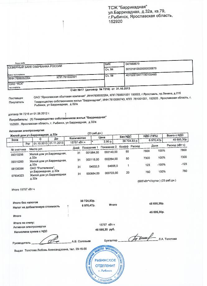 Счет ОАО "ЯСК" Октябрь 2013г.