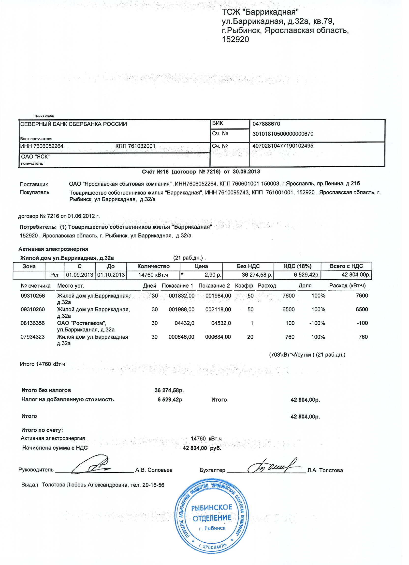 Счет ОАО "ЯСК" сентябрь 2013г.