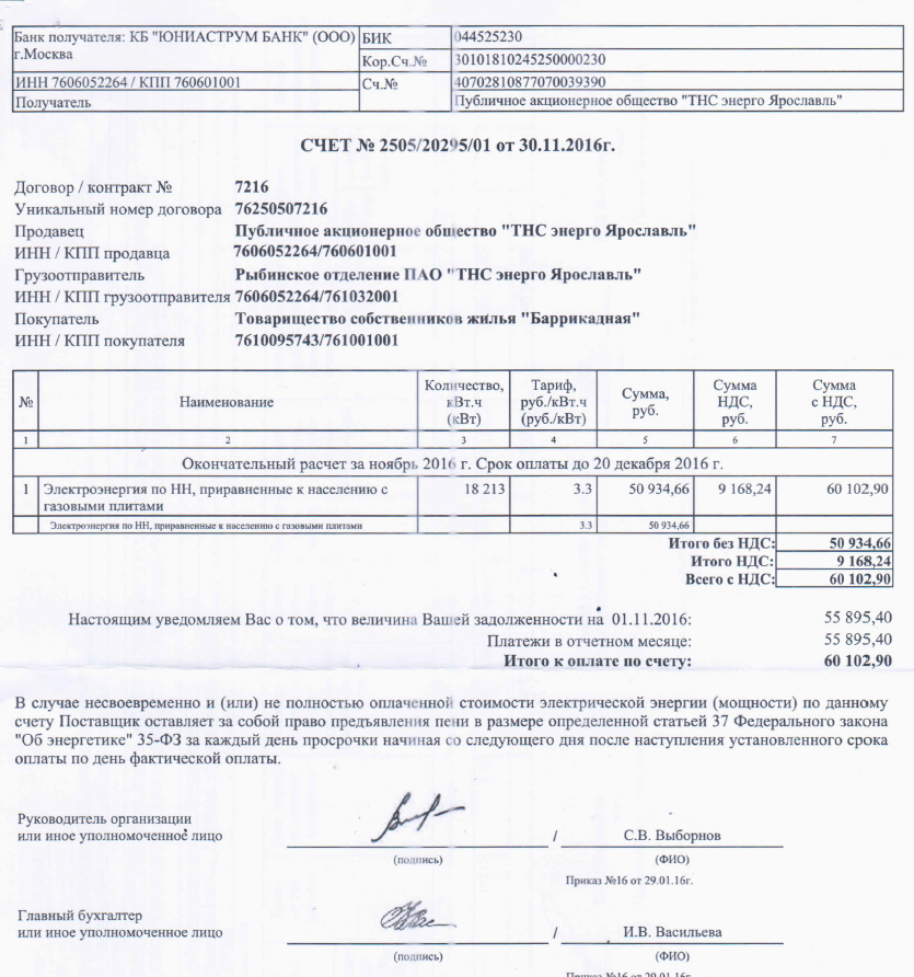 Счет ПАО "ТНС энерго" ноябрь 2016г.