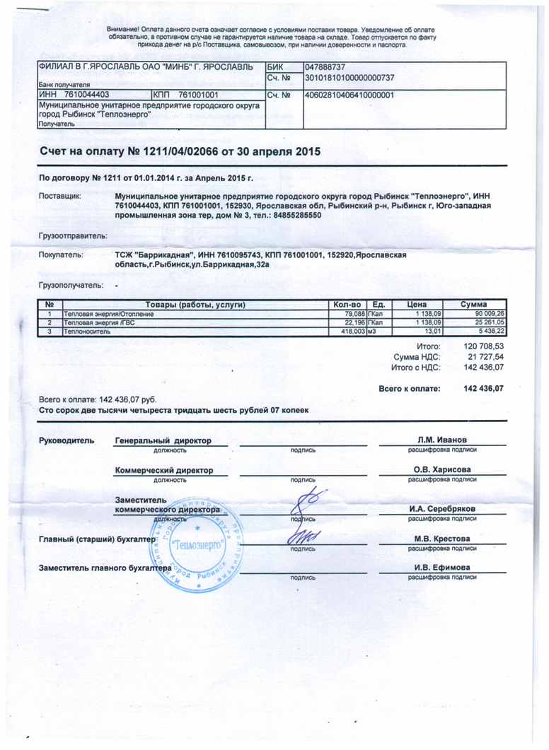 Счет МУП "Теплоэнерго" Апрель 2015г.