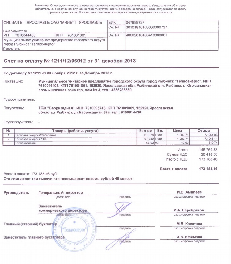 Счет МУП "Теплоэнерго" за декабрь 2013г.