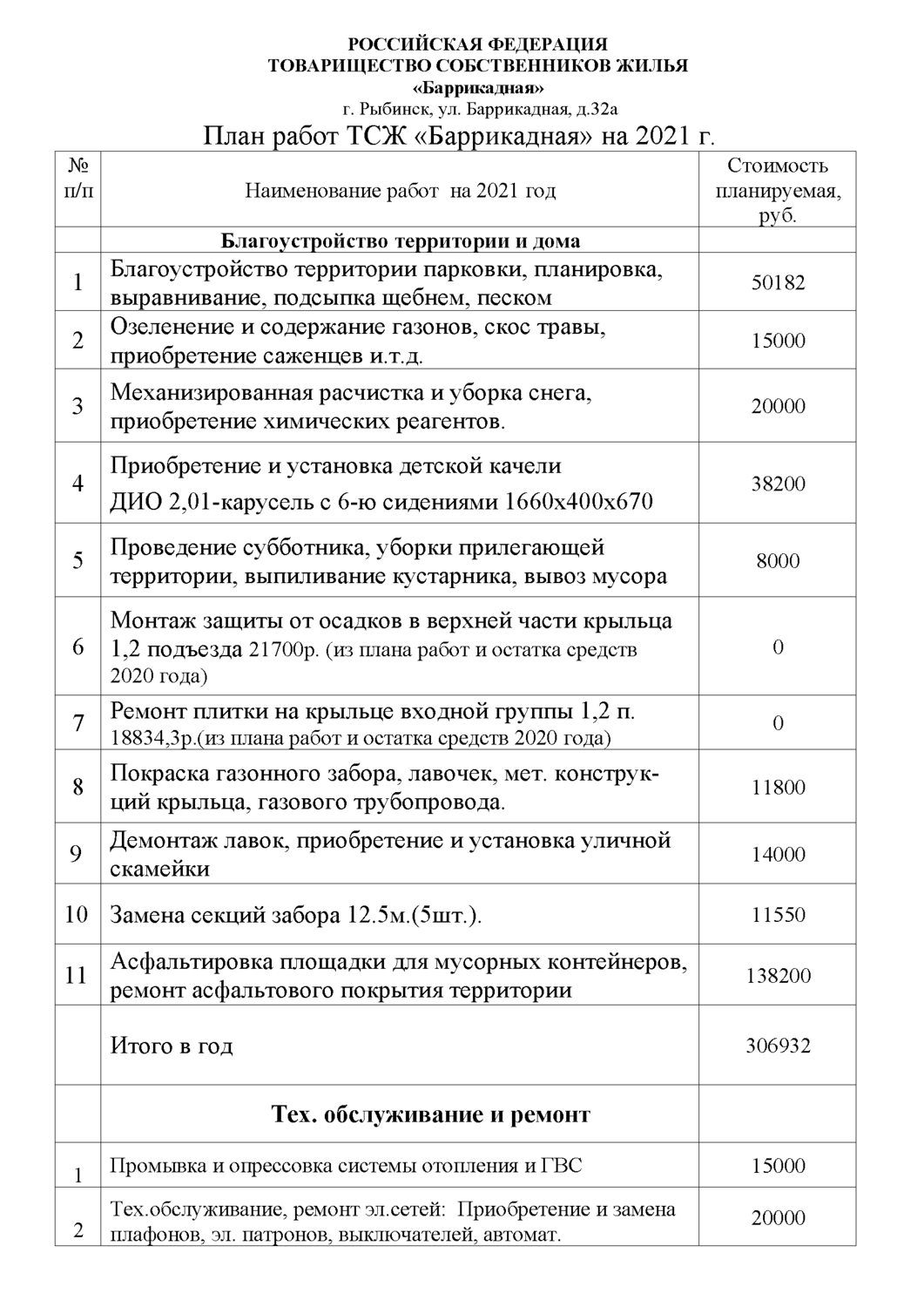 Тариф, план работ 2021